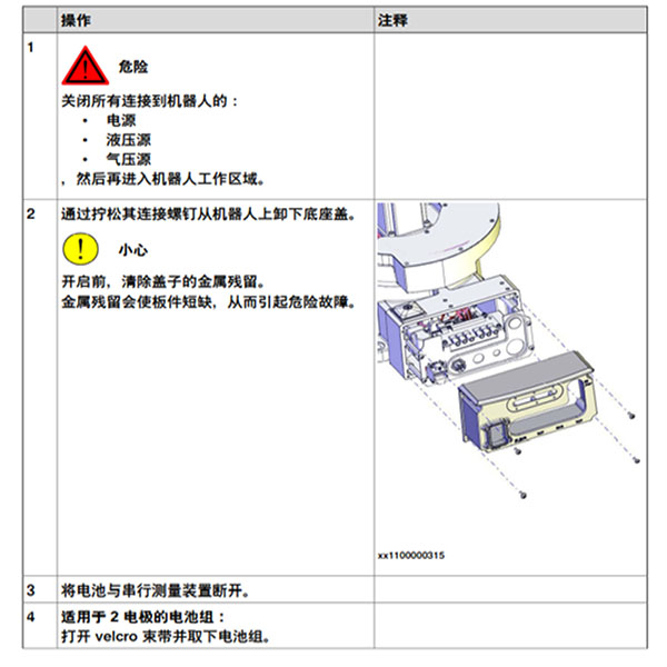 注意:當(dāng)需要更換電池時,將會顯示電池低電量警告(38213 電池電量低)。建議在電池 更換完畢前保持控制器電源打開,以避免機器人不同步。 對于具有 3 電極觸點的 SMB 電路板(RMU101 3HAC044168-001 或 RMU102 3HAC043904-001),新電池的壽命通常是 36 個月。 對于具有2極電池觸點的SMB板,如果機械手斷電2天/周,新電池的通常壽命為36個 月;如果機械手斷電16小時/天,則為18個月。通過電池停機維護程序,可延長壽命 以延長生產(chǎn)中斷時間。
